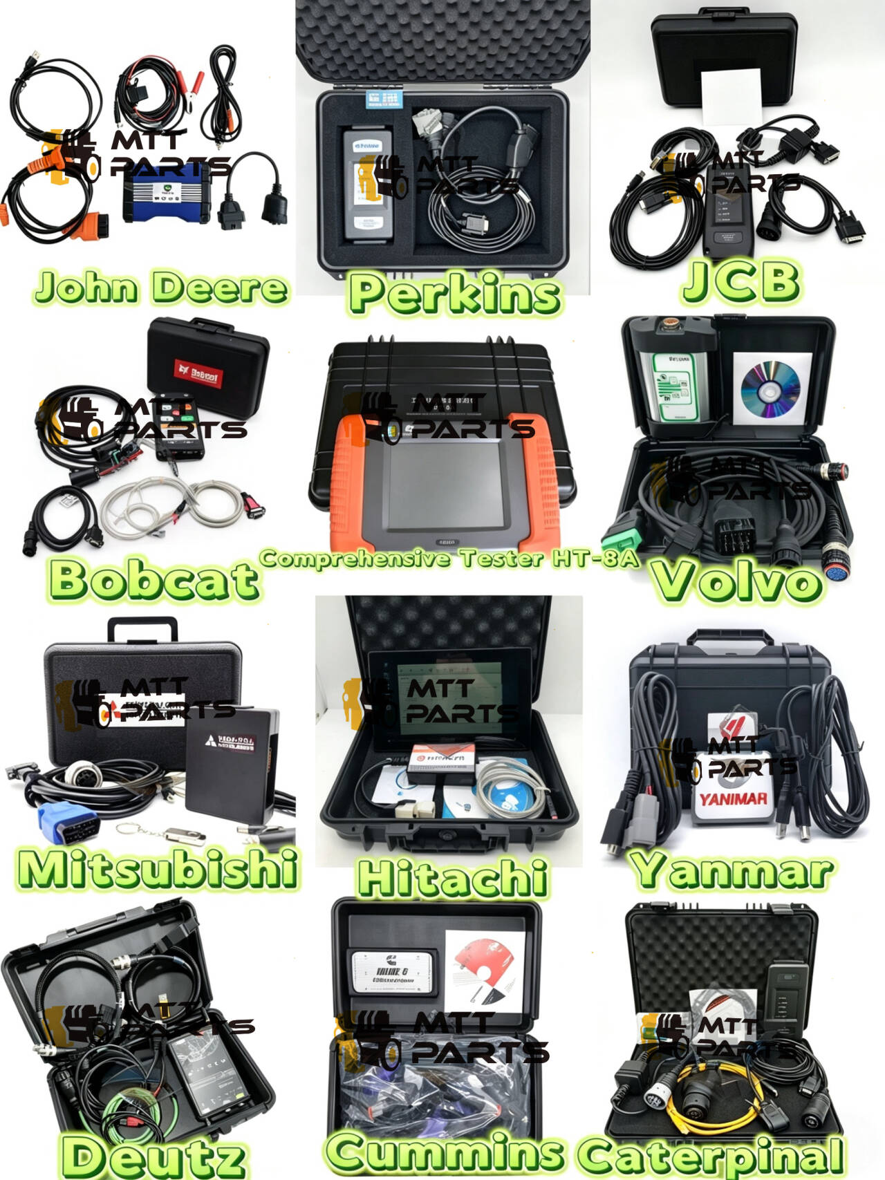 Що виділяється, так це те, наскільки вони практичні. Немає загальних інструментів, які можуть працювати наполовину; це індивідуальні налаштування бренду, які належним чином підключаються та дають вам потрібні дані. Є навіть універсальний тестер «все в одному» (HT-8A), показаний посередині, а також варіанти для брендів, для яких дещо важче знайти хорошу діагностику, наприклад Yanmar або Bobcat.